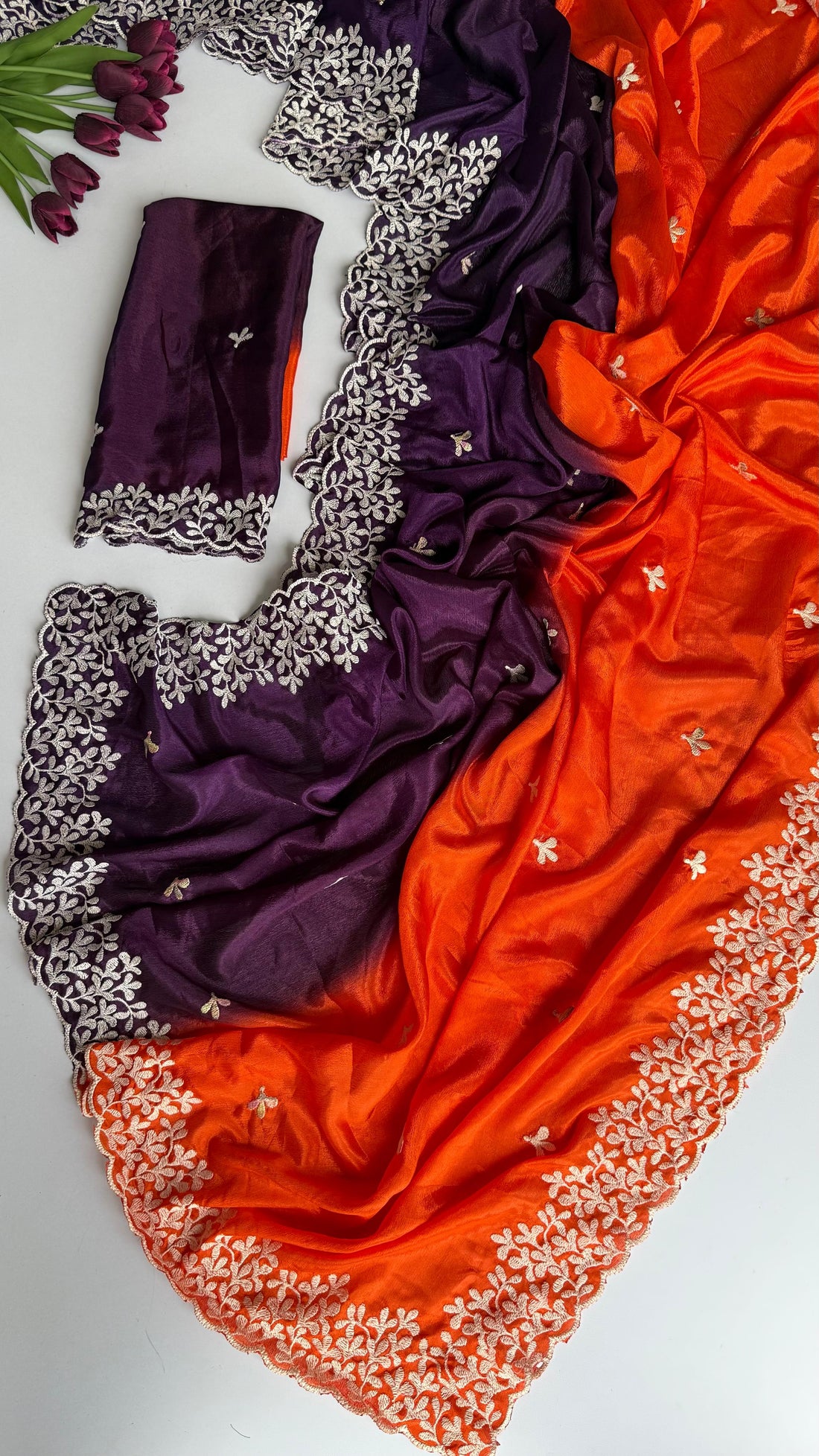 Paper silk crushed saree with beautiful sunflower embroidery work all over the saree with zari...