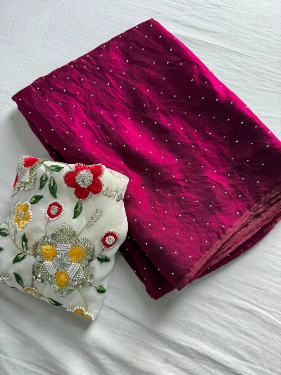 Soft Chinnon saree comes with a beautiful Handwork buties all over the saree and customised...