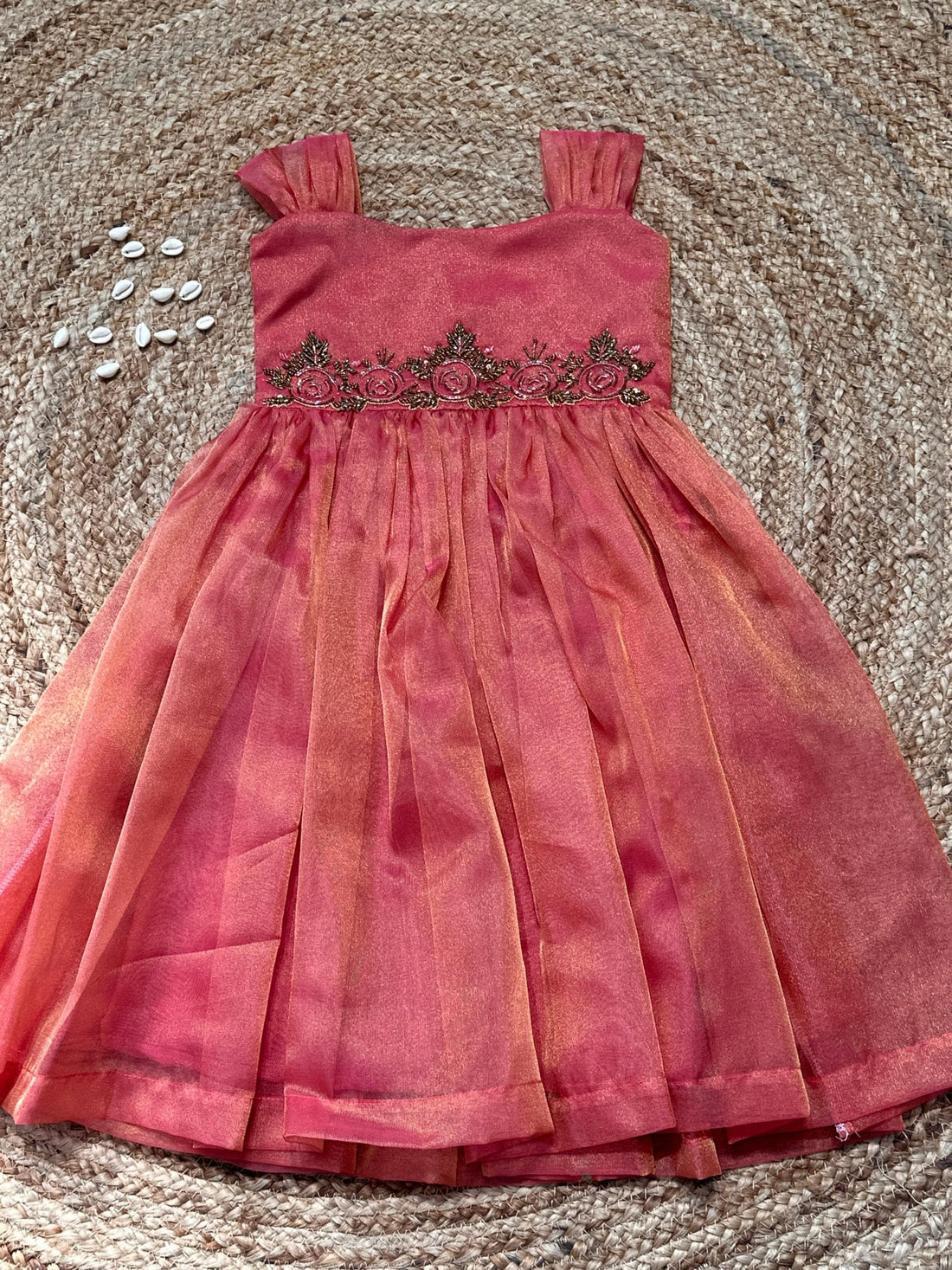 Classy Peach Frock handcrafted with a Rose Maggam work on a pure Tissue Organza silk...