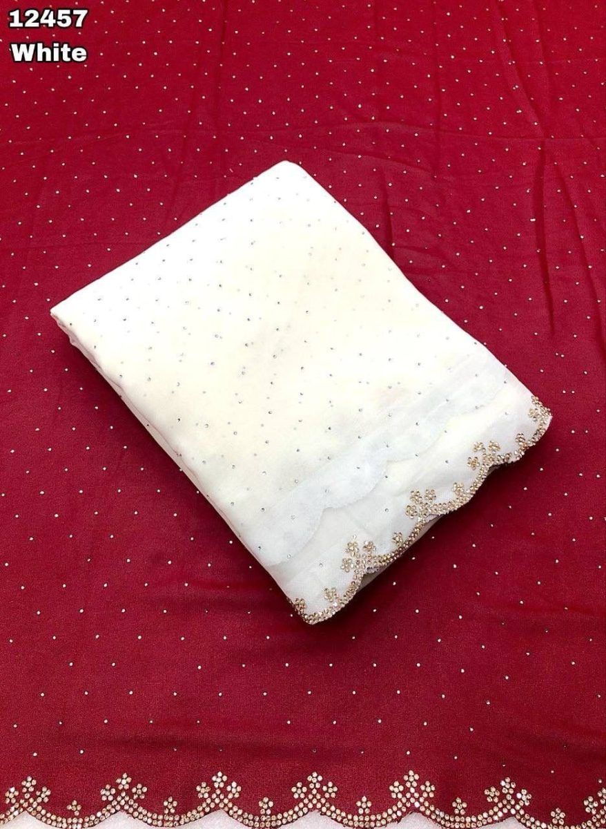 Fabric details - Weightless chiffon Offwhite colour saree with jarkhand hand stone work with scalloped border