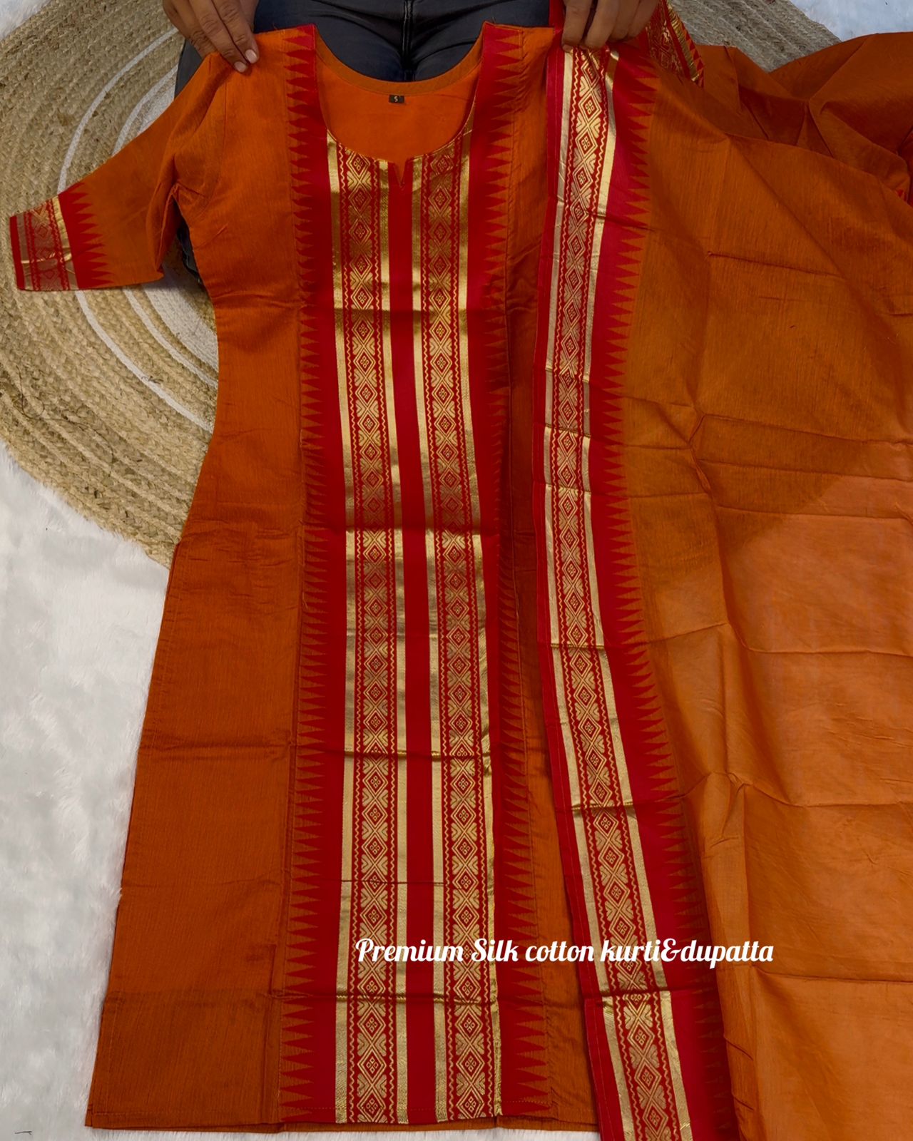 Elevate your style with this stunning pure silk cotton Kurti set with beautiful zari kanchi border work and beautiful contrast zari weaving dupatta and This is perfect upcomingPongal and festival wear
