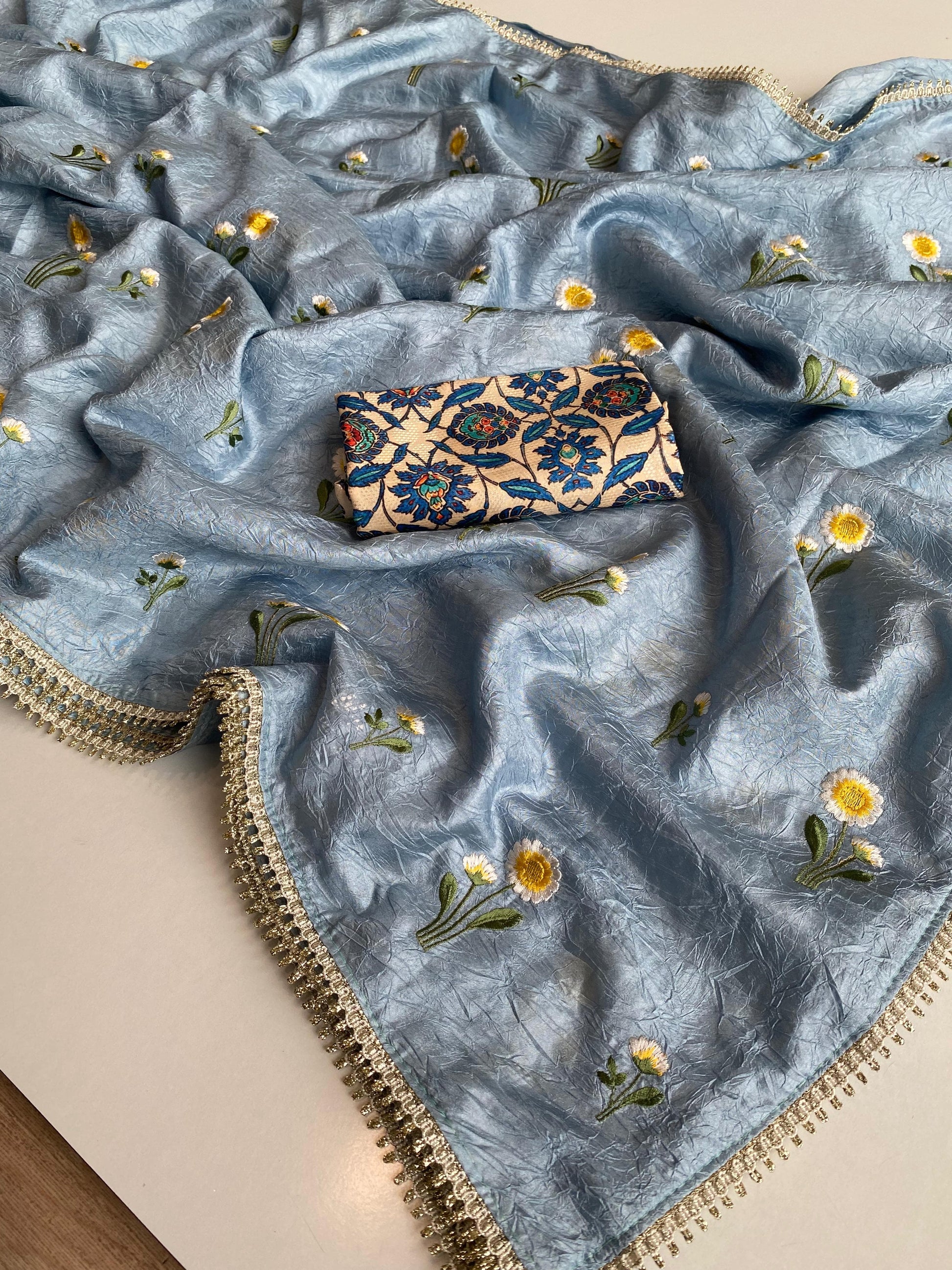 Paper silk crushed saree with beautiful sunflower embroidery work all over the saree with zari lace stitched on border.