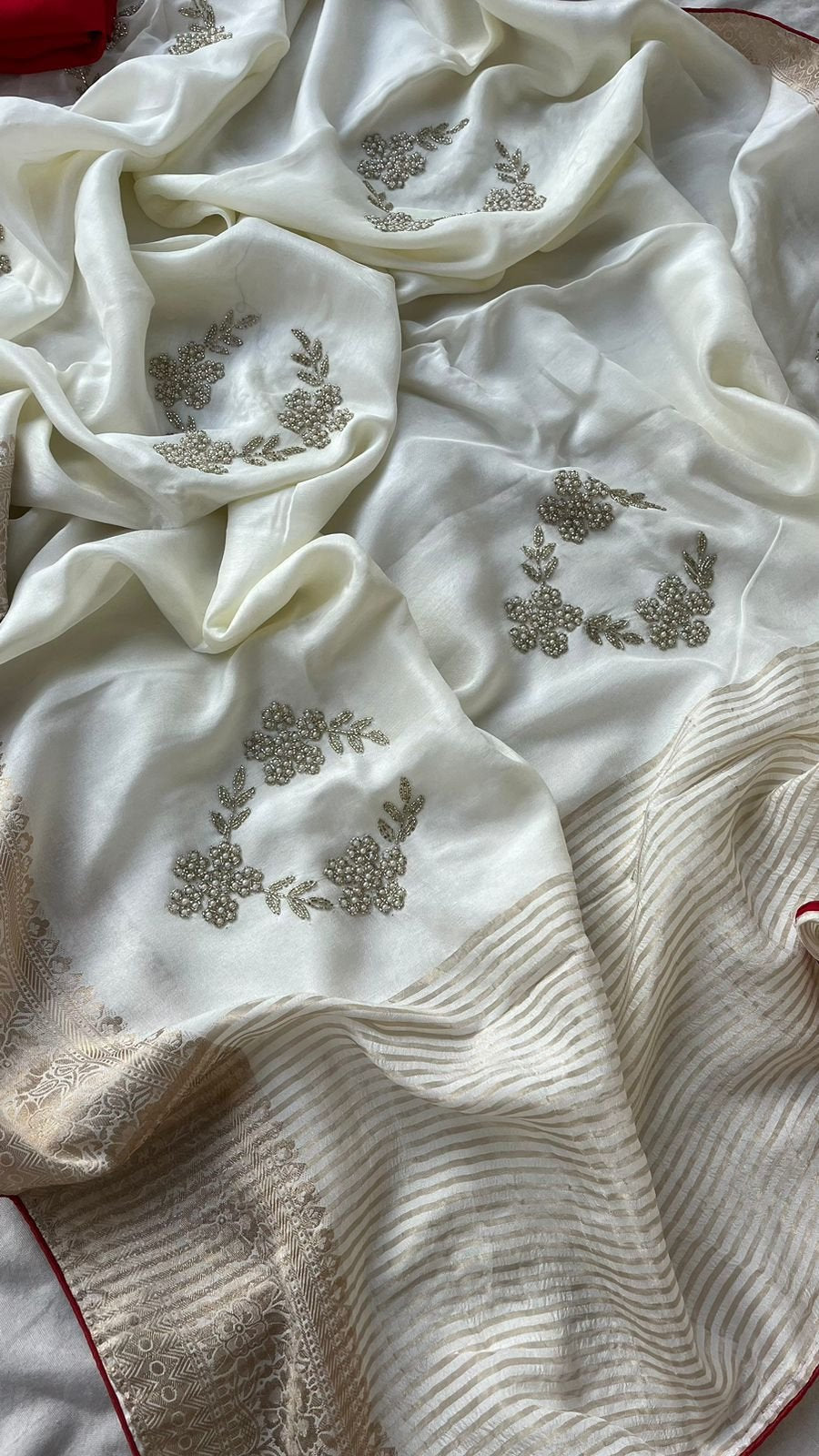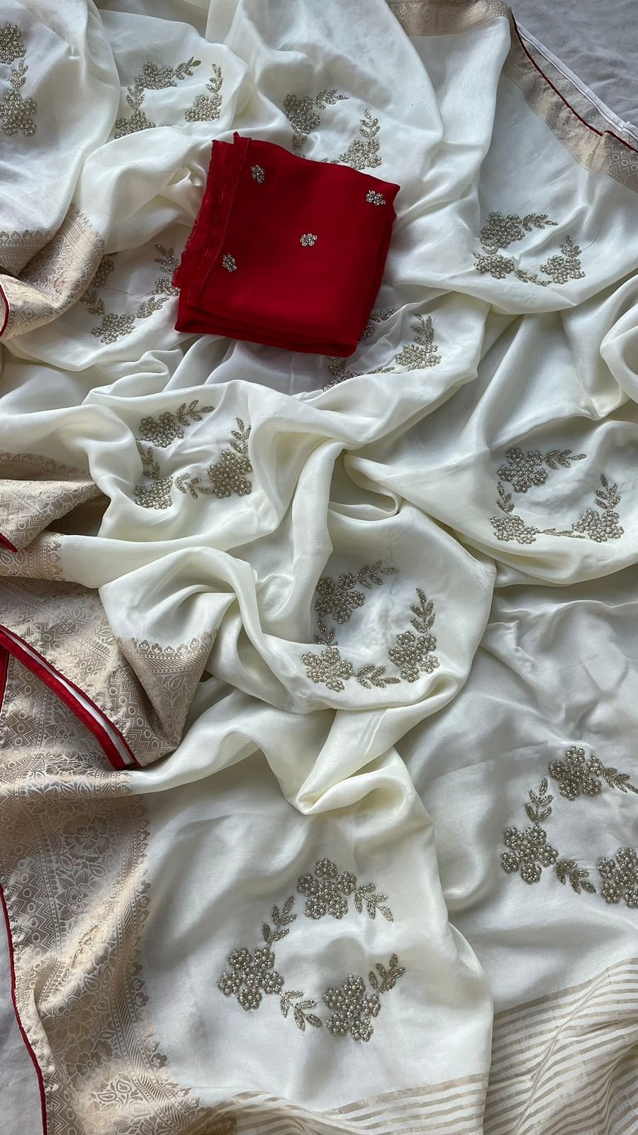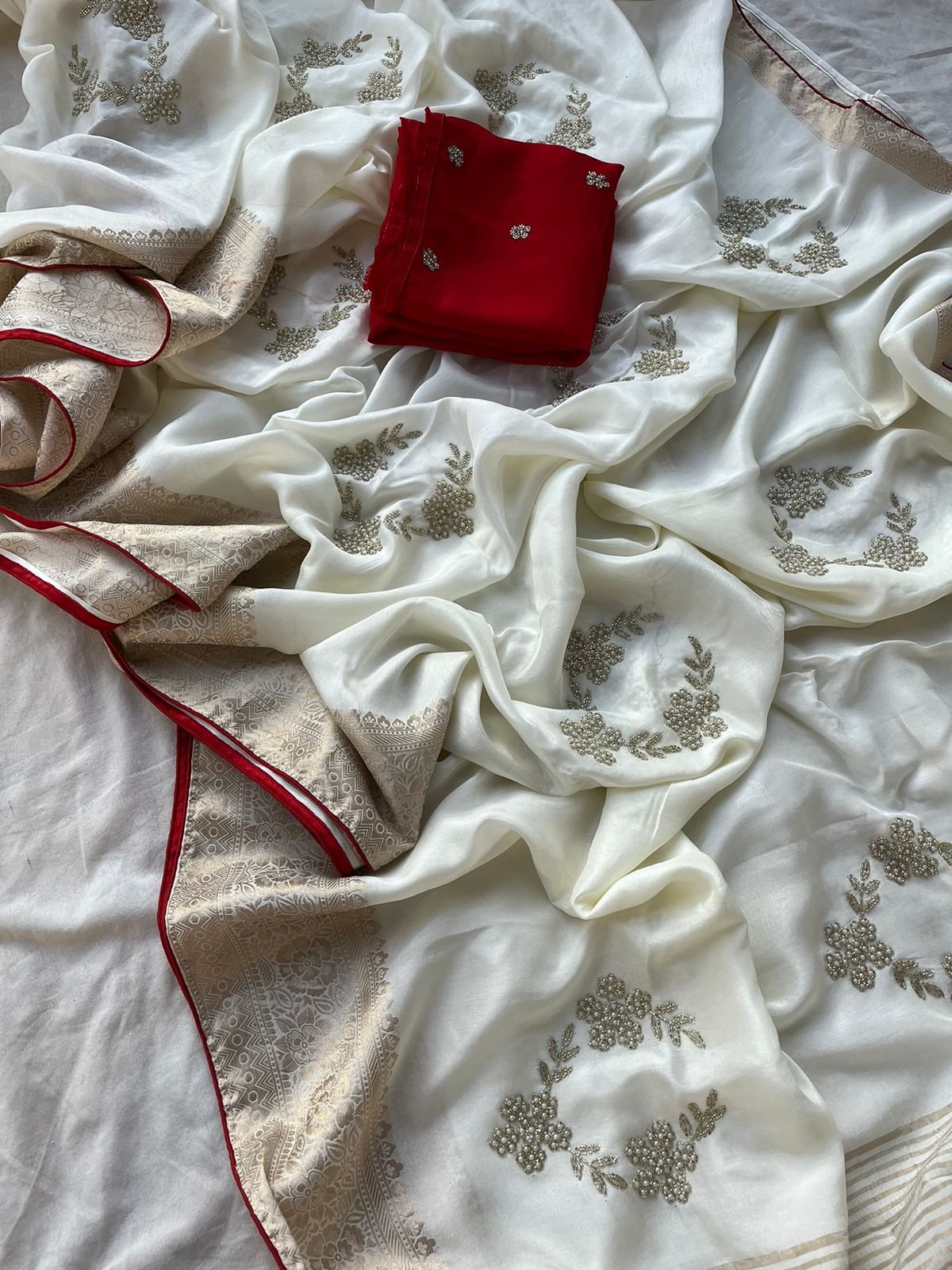 Premium And Pure Banarasi Munga Silk Saree comes all over Maggam work Handcrafted Buties which are so fine and beautiful and Teamed with a classy contrast color Maggam worked Blouse Piece π