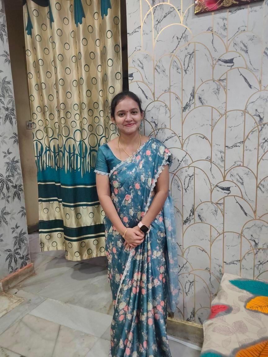 Pure Satin georgette saree with elegant print on all over the saree and Beeds cut work border attached on saree and Teamed with negative digital print blouse with beeds cut work border