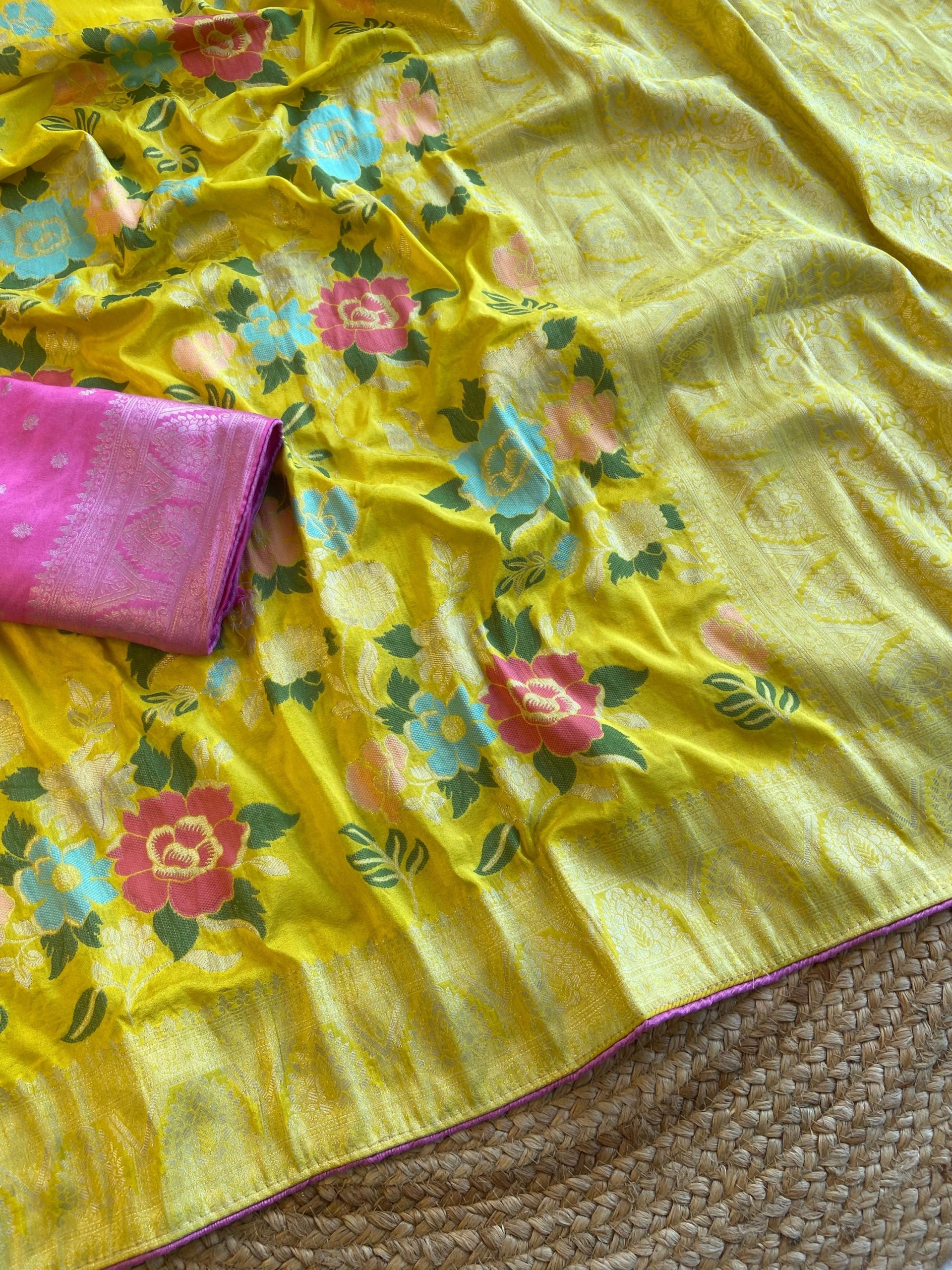 *WORK :-HAND DAYING SINGLE COLOUR WITH ZARI BUTTI CONTRAST BLOUSE CONTRAST COLOUR DORI PIPING*