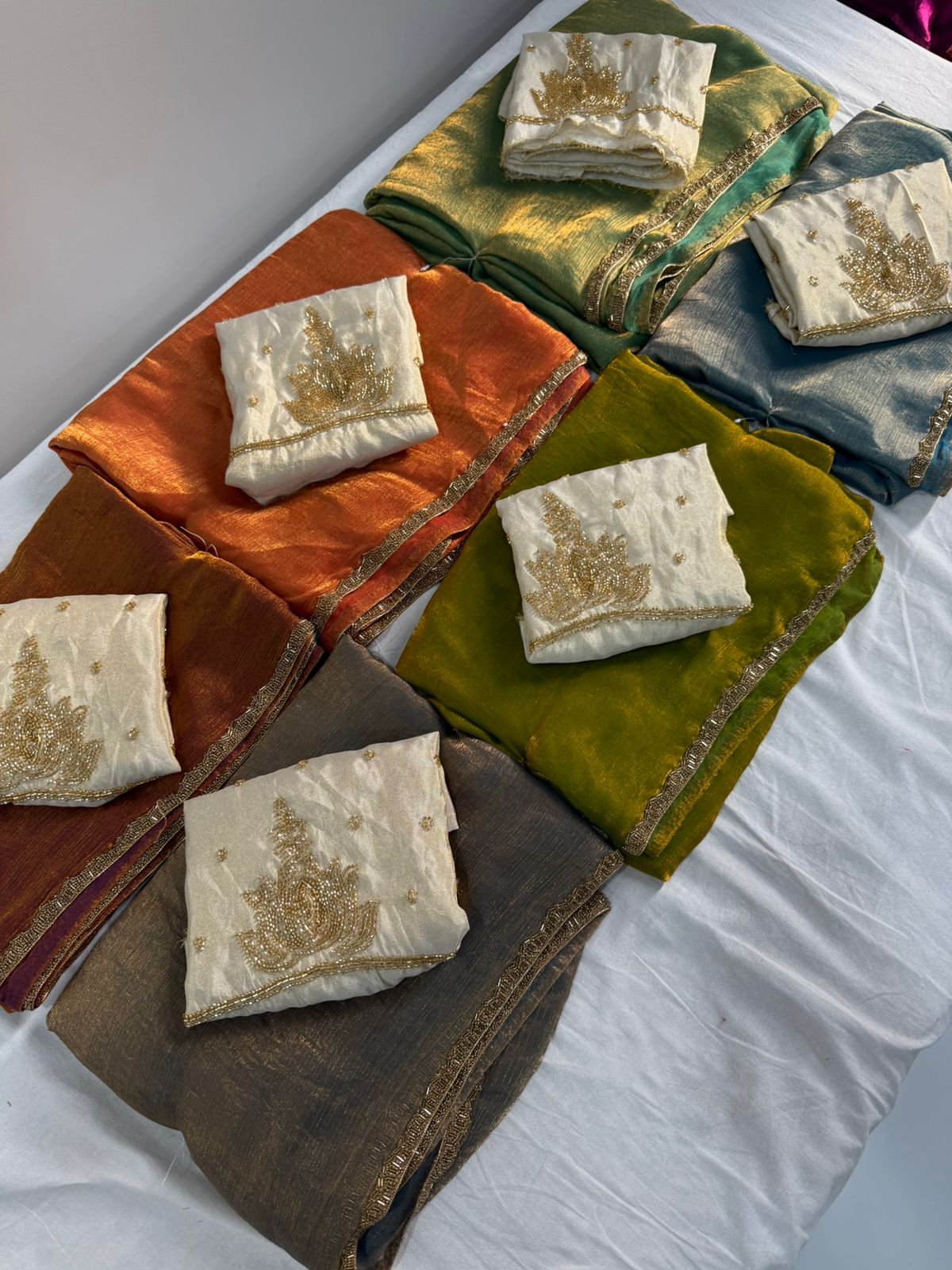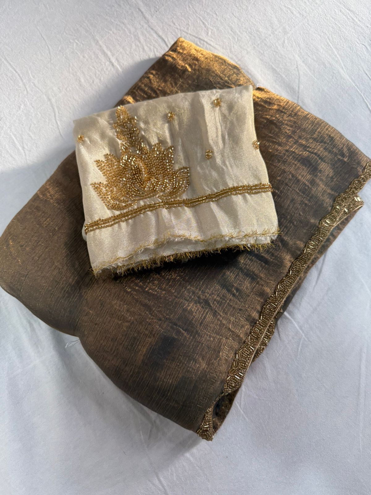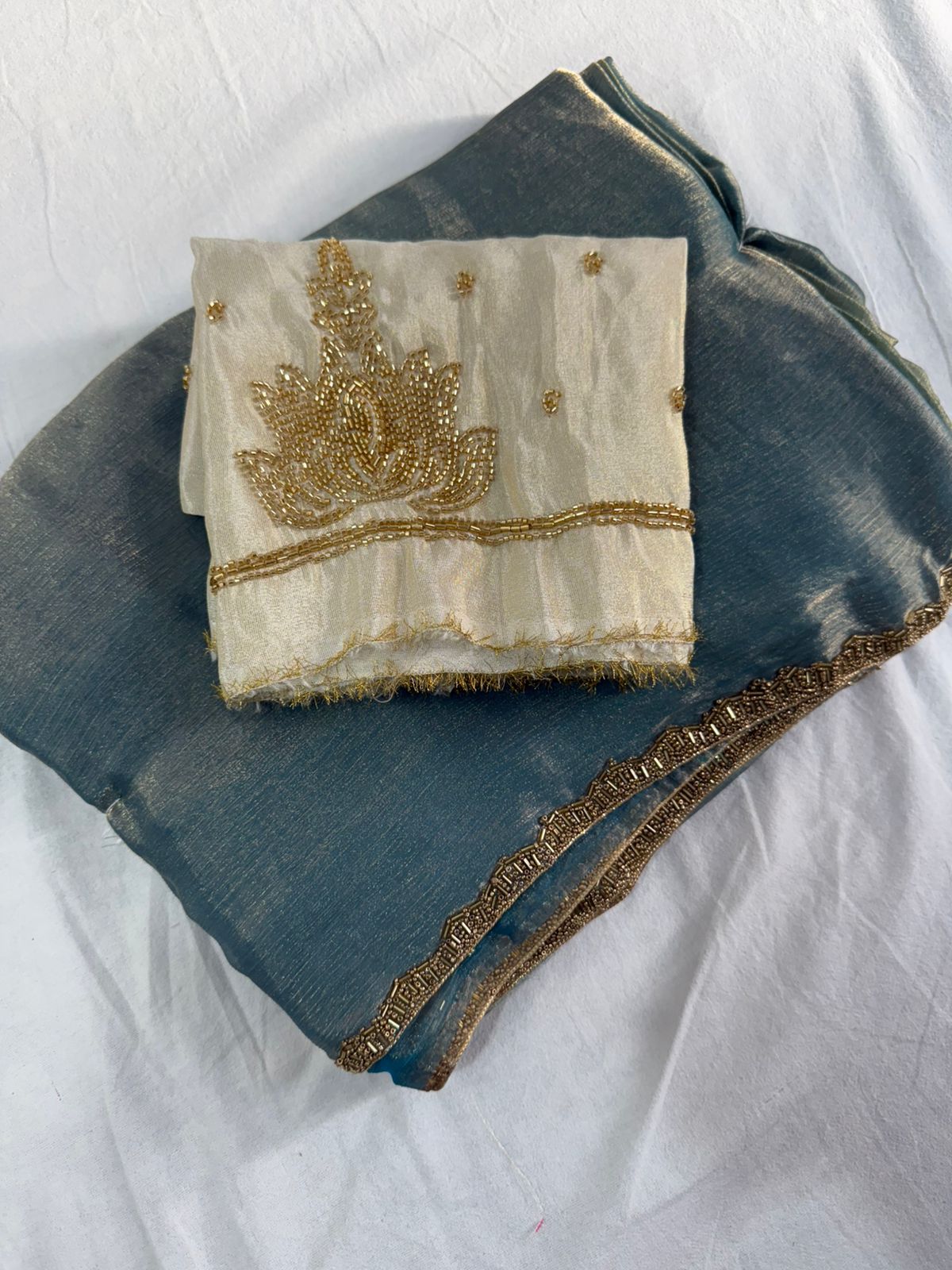 Space Fendy Chiffon Dual Shad Saree With Tissue Silk blouse which is customised Magam Work on sleeves in a flower maggam work design (Unstitched)