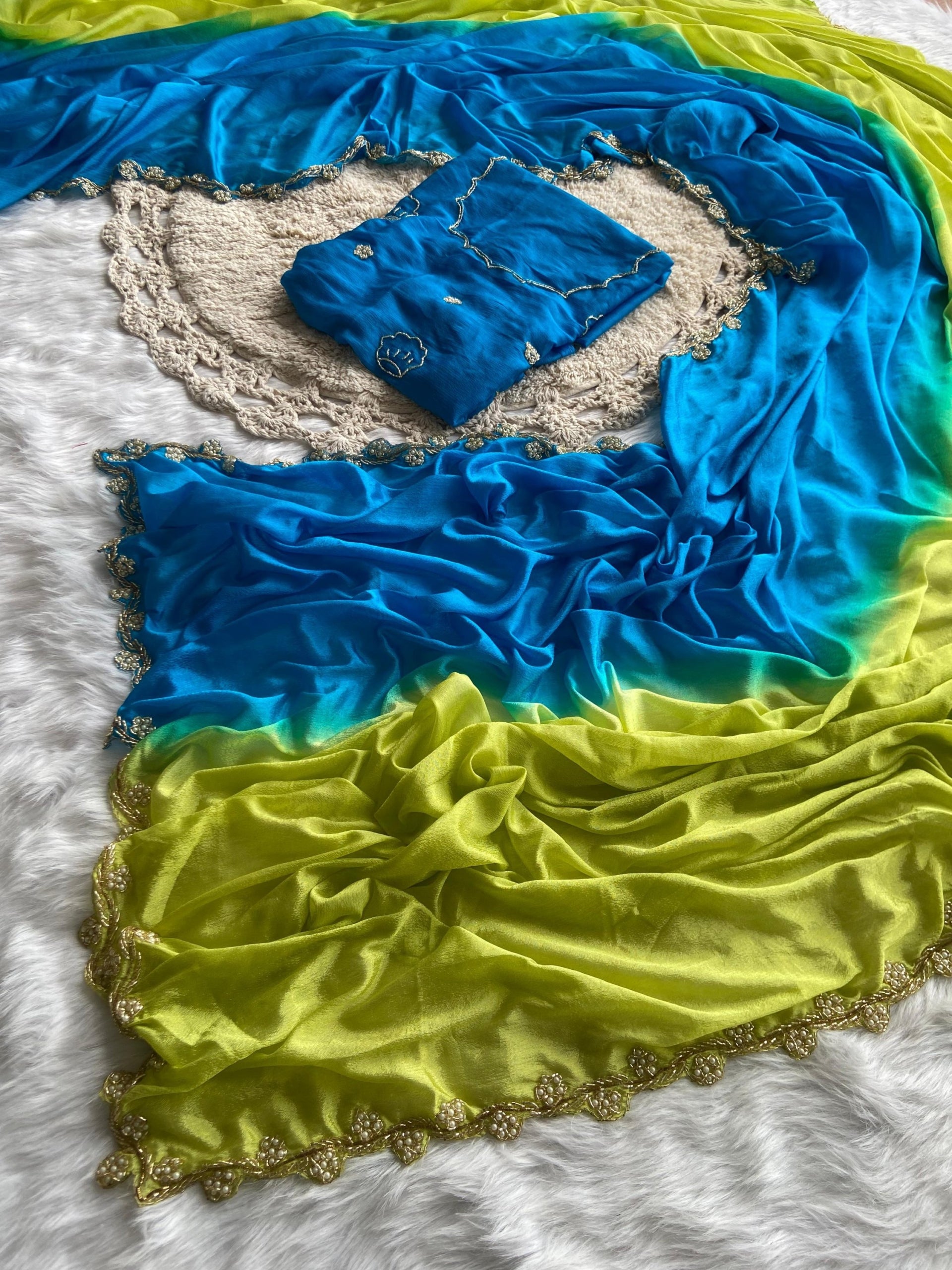 Soft Handworked hand dye Chinnon sarees are the real deal! Just look at this beauty-a dreamy duals (Blue + Green) paired with contrast Blouse, adorned with stunning zardozi Cutdana and Pearl Real embroidery that screams elegance!